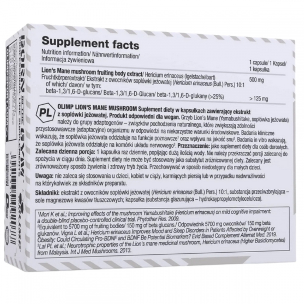Suplement diety Olimp Lion’s Mane Mushroom jest przeznaczony dla osób dorosłych.