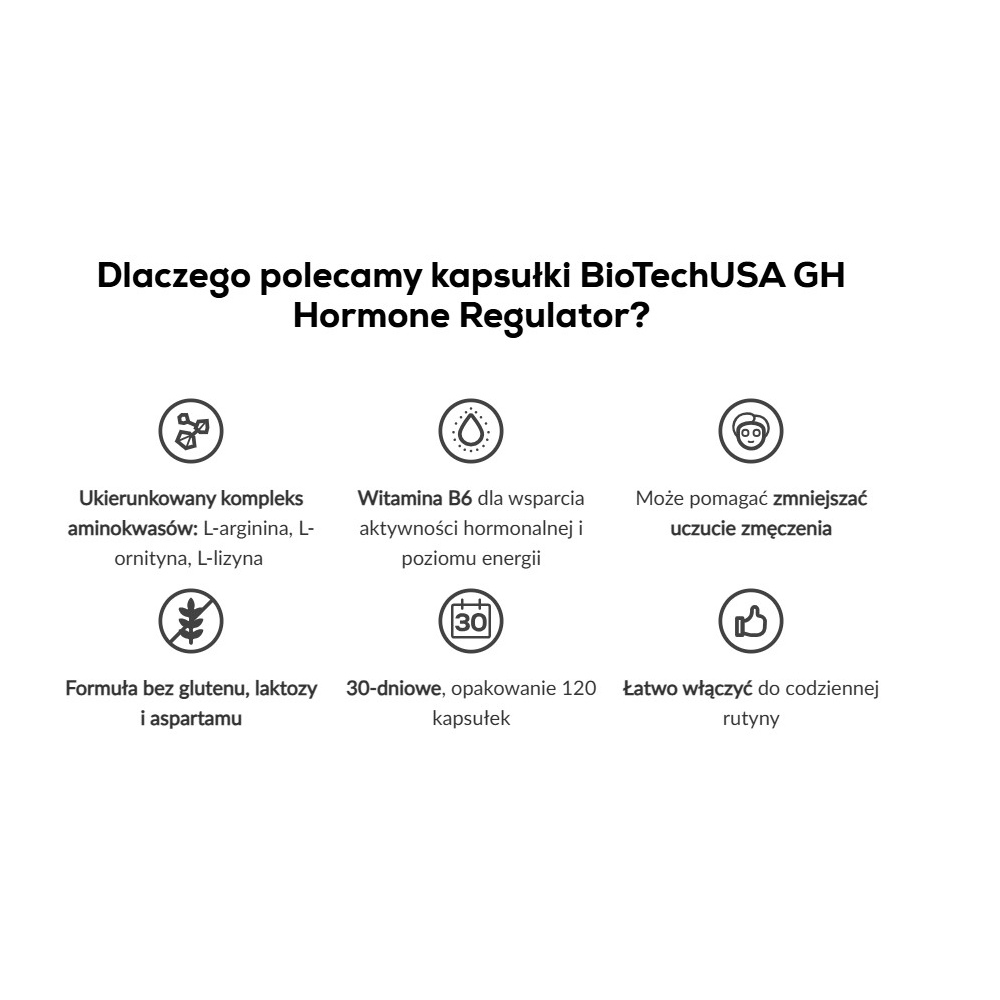 Suplement diety GH Hormon Regulator marki Biotech został stworzony z myślą o sportowcach dyscyplin siłowych, którzy chcą wesprzeć wzrost masy mięśniowej w naturalny i bezpieczny dla zdrowia sposób. W skład produktu wchodzi między innymi AAKG i ornityna, których działanie znakomicie wpływa na rozwój muskulatury. Całość w formie niewielkich, łatwych w suplementacji kapsułek.