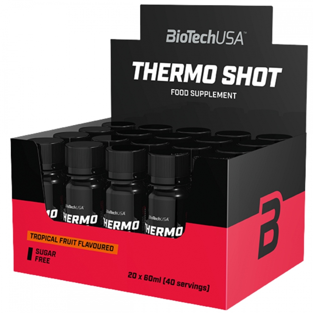 Thermo Shot jest to spalacz tłuszczu w formie wygodnego szota przedtreningowego. Wysoka zawartość kofeiny (92 mg/porcję [30 ml]).